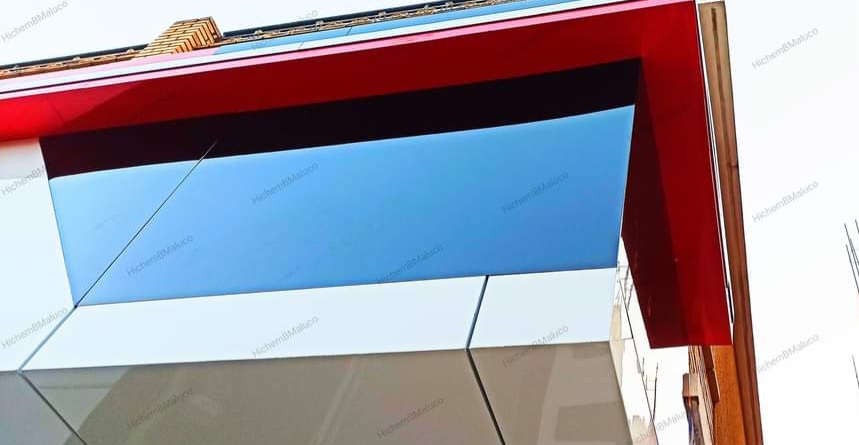 FRIZO DE ALUCOBOND. Posted on junio 27, 2025 by www.dialvisa.com.ec El frizo esta hecho con una estructura metálica y colocado alucobond silver, rojo y negro. Hecho con diseño arquitectónico.